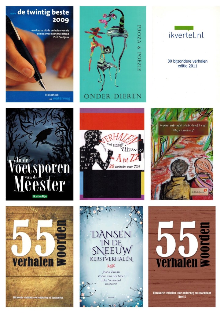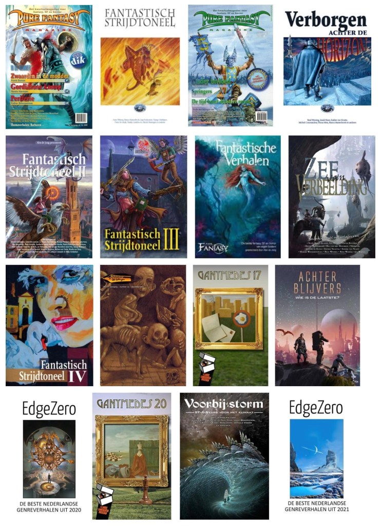 Oorspronkelijk volgde onder deze kop een uitputtende lijst, inclusief allerlei links naar verhalen of recensies, van zo ongeveer ieder kort verhaal dat ik vanaf 2005 publiceerde. Maar… nu ik dit typ (op 15 september 2023) is het aantal publicaties van die korte verhalen langzaam maar zeker uitgedijd tot meer dan vijftig. Die lijst gaat waarschijnlijk niemand meer helemaal bekijken, dus doe ik het nu anders. Ik laat het bij de twee onderstaande overzichten van wat ik in de achttienjarige periode tussen 2005 en 2023 produceerde in mijn twee favoriete genres. Alleen wat in september 2023 of daarna uitkwam, vermeld ik nog apart.